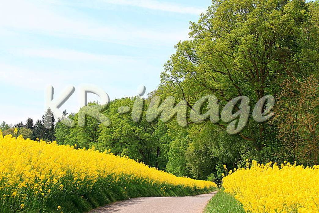 Wunderbarer Feldweg in mitten eines Rapsfeldes am Waldrand.
